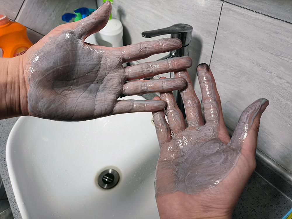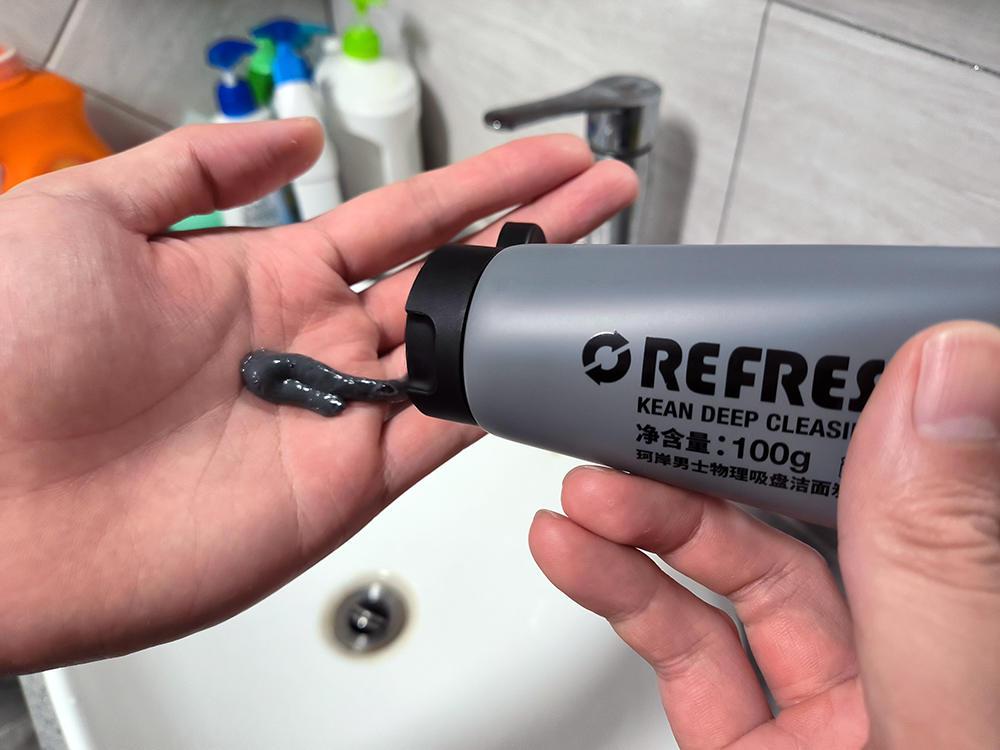 物理吸盤潔炭面泥則是灰色的膏體,通過雙手的揉搓會泛有微微的白光。在使用過程中不會像氨基酸潔面慕斯產(chǎn)生綿密的泡沫,需要在面部充分揉搓,使其物質(zhì)滲透在肌膚深層中才能實現(xiàn)污濁吸附的果。清水沖洗過后,給我的感覺面部肌膚瞬間清爽,對臉部泛白光,表面暗沉有著很大的改良。