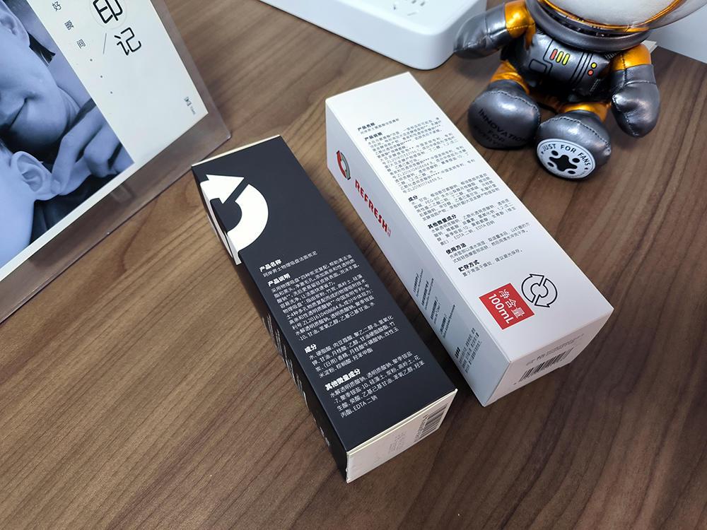 兩個獨立的包裝,一黑一白的精致紙盒。頂部印有開啟刷新廣告語,應(yīng)該是寓意著面部皮膚每天都能改變一點。外包裝所展示的內(nèi)容極其豐富,產(chǎn)品的功能特征以及產(chǎn)品說明、成分介紹、使用方法等等均有細(xì)致展示。