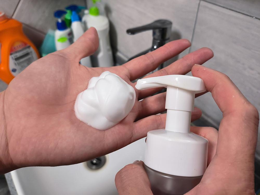 在實際使用過程中,氨基酸大豆?jié)嵜婺剿褂弥娣奖?。清水撲面過后,按壓一泵到泡沫到手心即可,完全節(jié)省了膏狀掌心揉搓的過程。通過手掌鋪開展示,泡沫細(xì)膩且均勻,直接涂在臉上即可。使用感受很溫和,沒有任何的刺激感。清水沖洗過后面部肌膚的舒適,無任何緊繃感。其皮膚表面有持久的保濕果,水潤不干燥。