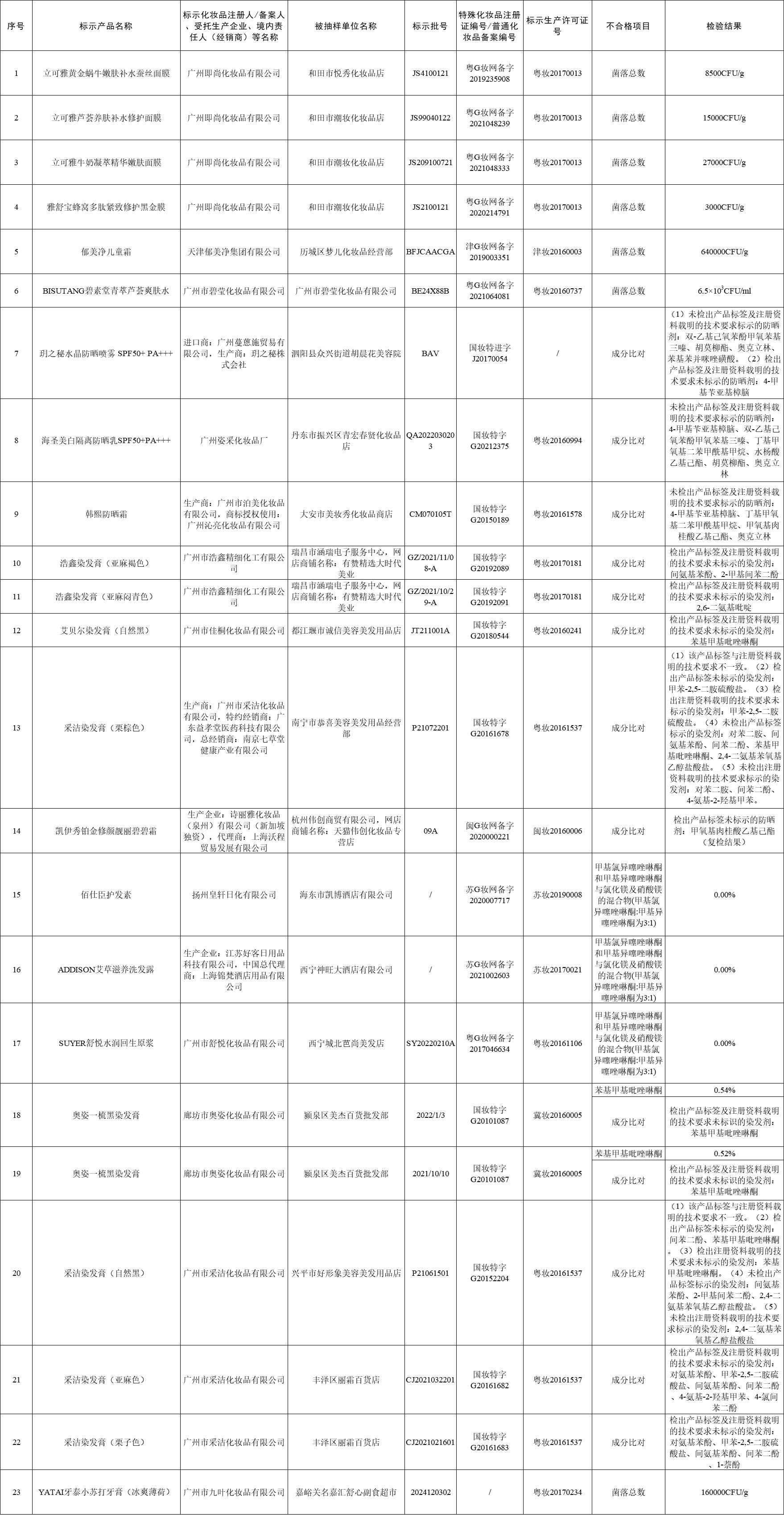 新京報(bào)貝殼財(cái)經(jīng)記者注意到,標(biāo)示為天津郁美凈集團(tuán)有限公司生產(chǎn)的“郁美凈兒童霜”1批次產(chǎn)品菌落總數(shù)超標(biāo);韓熙防曬霜、浩鑫染發(fā)膏等13批次產(chǎn)品成分比對(duì)不合格;佰仕臣護(hù)發(fā)素、ADDISON艾草滋養(yǎng)洗發(fā)露等5批次產(chǎn)品防腐劑和重金屬含量超標(biāo)。