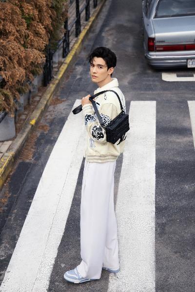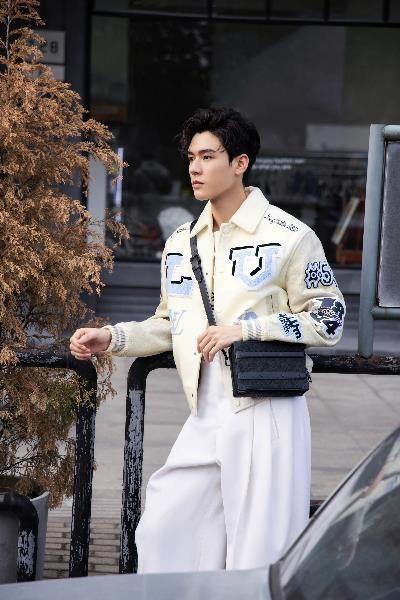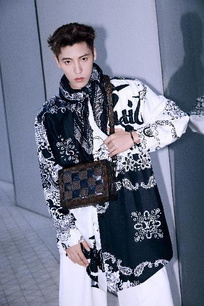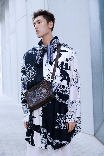 王子異身著拼接印花長(zhǎng)襯衫搭配路易威登 Soft Trunk 手袋,叛逆展露不羈態(tài)度。脖子上系了同花色的絲巾增加了整體的氛圍感和精致度。褲裝上選擇了簡(jiǎn)約的白色闊腿褲使造型上有一定的留白,增加了呼吸感。