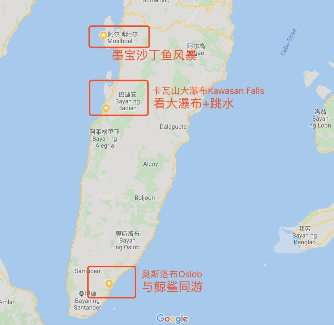 宿霧是一個(gè)狹長的島嶼,一些玩耍點(diǎn)離市區(qū)挺遠(yuǎn)。跳大瀑布+沙丁魚風(fēng)暴,參加這兩項(xiàng)活動建議住在墨寶(Moalboal)附近。