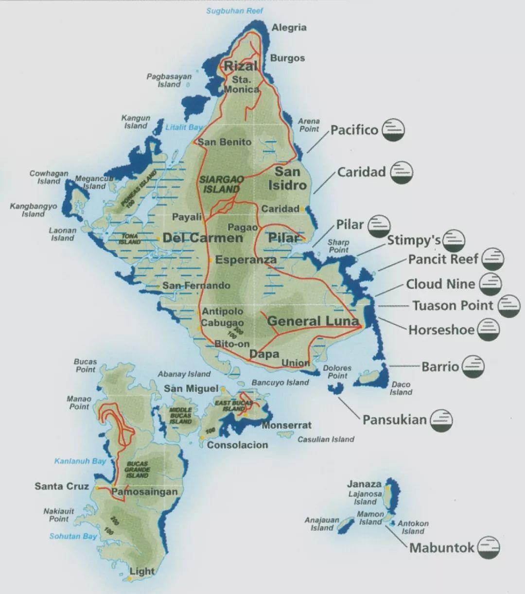 除了有名的Cloud 9,其實(shí)錫亞高其他好沖的地方也不少,下圖有標(biāo)明小圈圈的,都是錫亞高的沖浪好地。