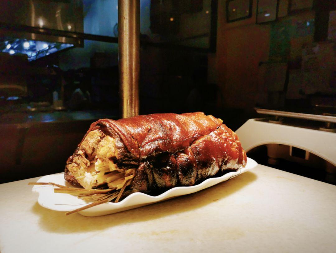 有名的烤豬肉被裝在豬頭盤子里,皮被烤得很脆,與牙齒碰撞,會有清脆的聲音與在口腔里回蕩。豬肉也烤得很嫩,口感是Q彈的,用烤的方式,能大化地釋放出豬肉本身的香味。