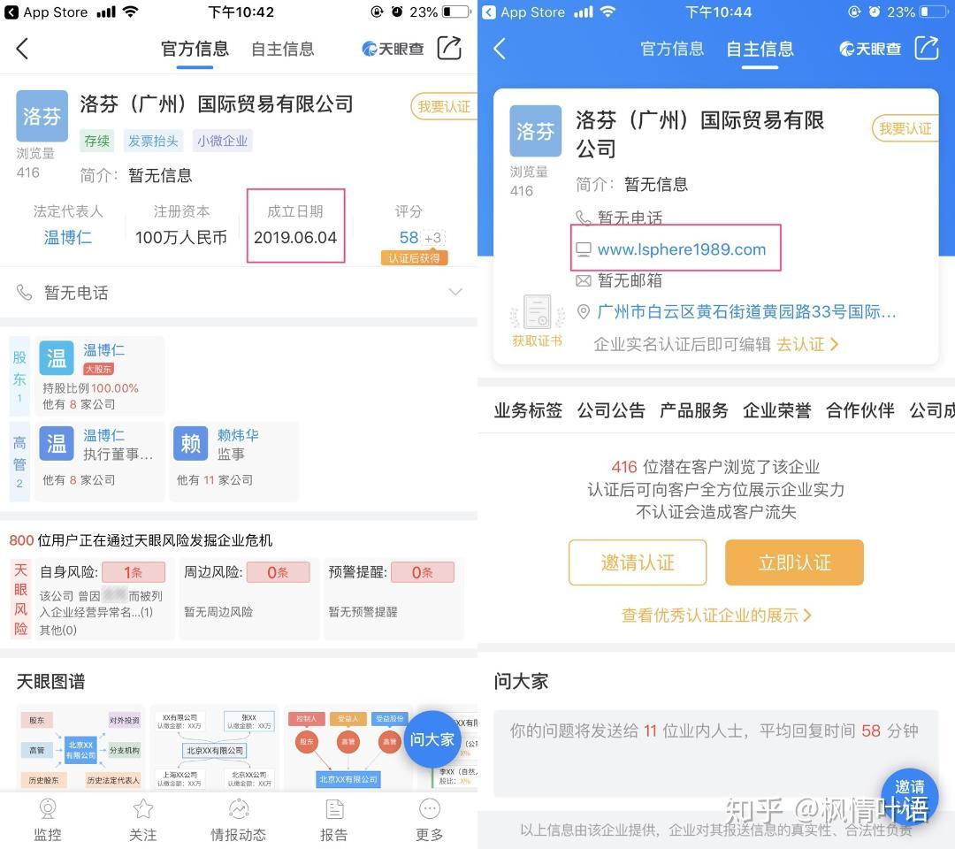 此外,知乎網友@楓情葉語在知乎上表示,其在登陸英國倫敦商業(yè)注冊網站后發(fā)現,洛芬國際控股集團于2014年英國倫敦注冊成立,且目前的業(yè)務性質是“Dormant Company”(休眠公司),而LSphere(倫敦圈層)在國內的委托方,洛芬(廣州)國際貿易有限公司在天眼查上的官方信息顯示,成立日期在2019年06月04日。
