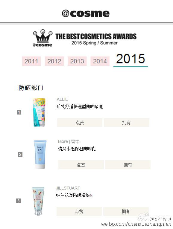 2015上半年日本暢銷防曬霜COSOME大賞--新的COSME彩妝大賞出爐了,作為日本的彩妝護膚品排行榜單上榜的產(chǎn)品均為好用及銷量并重的口碑品。小編會分類給大家介紹分析下。今天先說防曬篇: