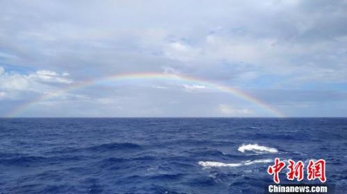 遠望7號左舷,橫跨在湛藍海水上的彩虹。 溫孟馨 攝
