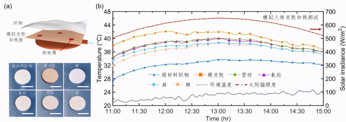 超材料織物與商用織物降溫性能對比測試:(a)測試裝置示意圖和樣品照片(b)超材料織物制冷性能對比測試曲線圖(廣州,2020年11月28日)。受訪者供圖