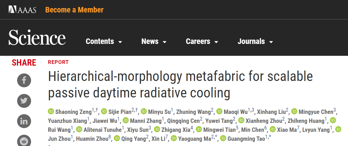 用科學(xué)術(shù)語說,“超構(gòu)織物”能夠通過分級形態(tài)設(shè)計,調(diào)諧對太陽光波段和中紅外波段的光學(xué)響應(yīng)。既保持8~13微米波段的高發(fā)射率,大化熱輻射;又對0.3~2.5微米的太陽輻射實現(xiàn)高阻擋,實現(xiàn)在無能源輸入條件下,對覆蓋目標(biāo)物的全天持續(xù)進(jìn)行降溫,且綠色環(huán)保、柔軟親膚、舒適透氣。再用科學(xué)思路說,“超構(gòu)織物”是用物理光學(xué)和材料科學(xué)的協(xié)同創(chuàng)新來實現(xiàn)被動式降溫,替代傳統(tǒng)的主動降溫方式,意味著它是環(huán)境友好的、可持續(xù)發(fā)展的、順應(yīng)“碳達(dá)峰、碳中和”的綠色理念。