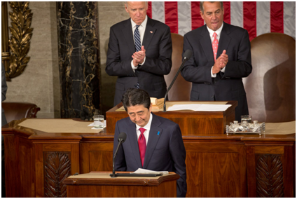 安倍是第一位到美國國會(huì)發(fā)表演講的日本首相,他站在美國重要的權(quán)力平臺(tái)上,花了40分鐘,用英文向美國議員們展示了一個(gè)“新日本”。2800多字的演講中,“聯(lián)盟”一詞出現(xiàn)了13次,毫不掩飾想要夯實(shí)外祖父岸信介倡導(dǎo)下建立的美日聯(lián)盟的用意。