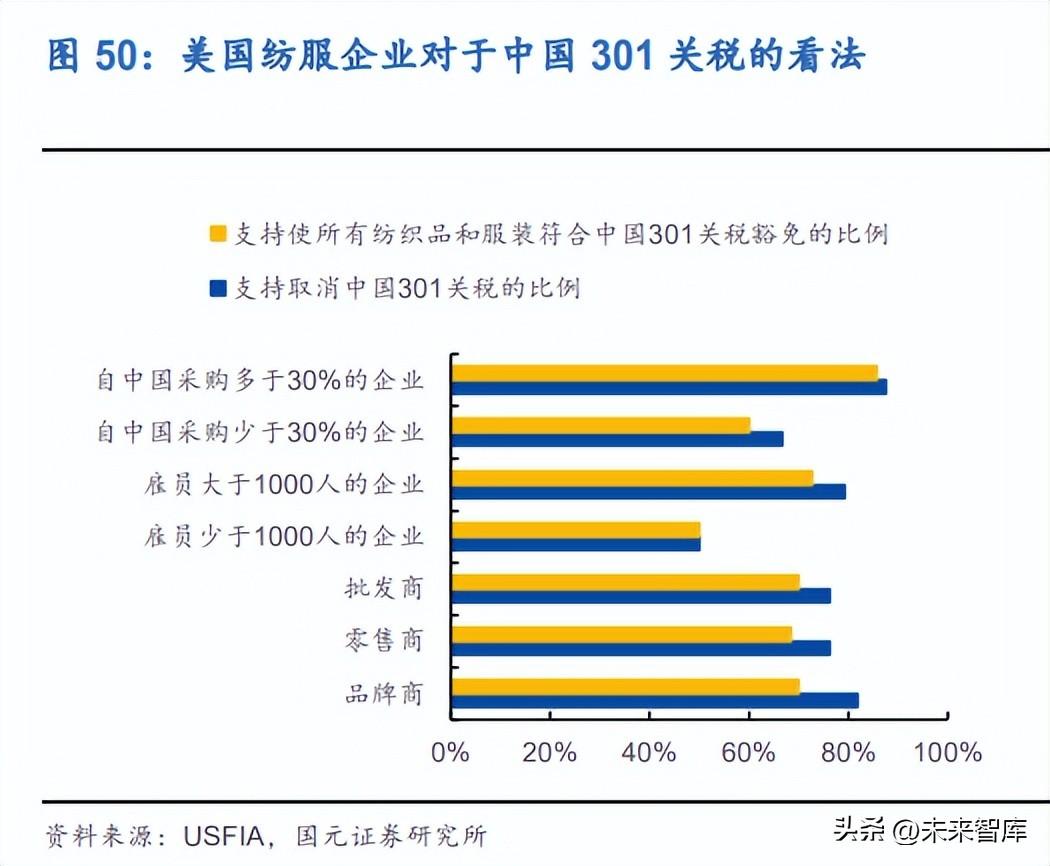 采購區(qū)域多元化趨勢更趨,小企業(yè)更偏好分散化采購。為適應(yīng)不斷變化的商業(yè) 環(huán)境,應(yīng)對船運延遲、供應(yīng)鏈中斷、采購來源過于集中等問題,越來越多的美國紡織 服裝企業(yè)關(guān)注采購多元化問題。根據(jù)美國時尚產(chǎn)業(yè)協(xié)會調(diào)研,2022 年 53.1%的受訪 企業(yè)采購地超過 10 個和地區(qū),高于 2021 年的 36.6%和 2020 年的 42.1%;其 中,50%員工數(shù)小于 1000 人的企業(yè)采購地超過 10 個和地區(qū),較 2021 年提升 22pct;56%員工數(shù)大于 1000 人的企業(yè)采購地超過 10 個和地區(qū),較 2021 年提 升 3pct,小企業(yè)的多元區(qū)域采購趨勢更為。