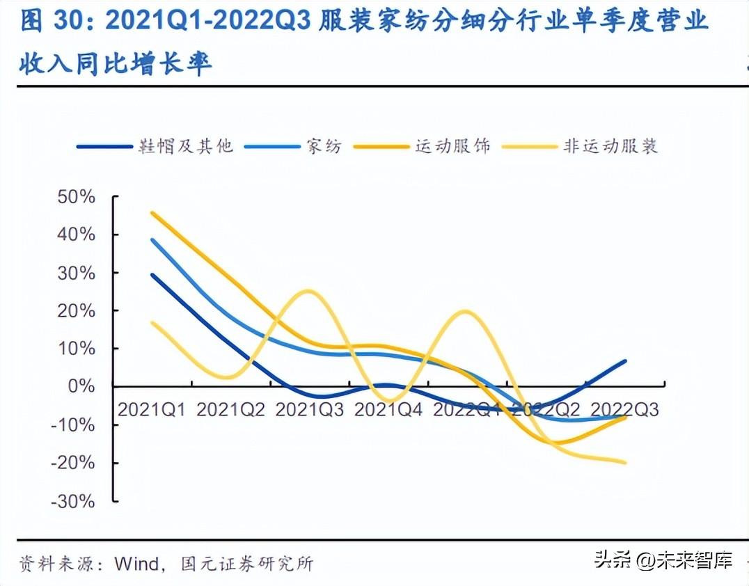 4、品牌服飾:服飾消費有望回暖,生活戶外成常態(tài)化需求時尚服飾方面,2022 年受國內(nèi)疫情影響,購物中心尤其是中購物中心的客流下 降。隨著疫情管控放松,線下零售消費需求或逐步恢復(fù),前期受損嚴重的中 購物中心客流回升彈性更大,而主要布局在此的中高端服飾品牌業(yè)績有望迎來較大 彈性的修復(fù)。在 2022Q3 整體時尚服飾品類開關(guān)店比僅為 0.63 的情況下,比音勒芬、 歌力思、欣賀股份等中高端服飾品牌仍然保持了較為穩(wěn)定的門店數(shù)量,隨著疫后消費 復(fù)蘇和部分品牌出清,門店數(shù)量穩(wěn)定的中高端品牌服飾或受益更。從行業(yè)零售額 同比增速及產(chǎn)成品存貨同比增速來看,行業(yè)目前處于主動去庫存階段,隨著消費需求 逐漸恢復(fù),品牌和經(jīng)銷商信心恢復(fù),零售額和存貨狀態(tài)或出現(xiàn)好轉(zhuǎn),邁入復(fù)蘇期。