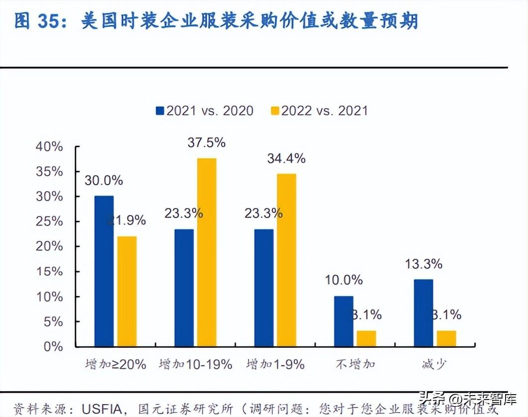 宏觀經(jīng)濟及供應(yīng)鏈因素影響下,美國紡織服裝業(yè)采購需求更為謹慎。根據(jù)美國時尚 產(chǎn)業(yè)協(xié)會 7 月發(fā)布的調(diào)研,2022 年美國時尚行業(yè)面臨了增長的生產(chǎn)或采購成本、運 輸延期和供應(yīng)鏈中斷、美國通貨膨脹和經(jīng)濟前景等諸多挑戰(zhàn),這些挑戰(zhàn)在未來仍將持 續(xù),其中,認為采購成裝成本進一步增加的比例較 2021 年提升 15.3pct。由于高通 脹、需求疲軟以及宏觀經(jīng)濟的其他衰退,近 40%的受訪時尚公司預(yù)計 2022 年財務(wù)狀 況比一年前更糟,比 2021 的 20%翻了一番,只有約 40%的受訪者認為財務(wù)狀況將 在 2022 年改良,遠低于 2021 的 70%。經(jīng)濟和公司經(jīng)營的不確定性導(dǎo)致服裝采購更 為謹慎,雖然有 93.8%的受訪者預(yù)計他們的采購價值或采購量將在 2022 年增長 (2021年為76.6%),但只有21.9%的受訪者預(yù)計采購價值或數(shù)量將增長20%以上, 較 2021 年的 30.0%顯著下降。