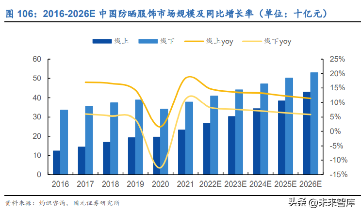 防曬服飾作為生活戶外一大細分賽道,迎來新發(fā)展機遇。在日常通勤、休閑運動、踏 青遠足、旅行度假等場景下,消費者對抗衰老和皮膚保護意識提高,相較于防曬霜, 防曬服飾具有無毒無害無刺激性可穿戴等優(yōu)點,再加上色彩款式的迭代創(chuàng)新,推動中 國防曬服飾行業(yè)市場規(guī)模增長。根據(jù)灼識咨詢,中國防曬服飾行業(yè)市場規(guī)模從 2016 年的 459 億人民幣增至 2021 年的 611 億人民幣,2016-2021 年 CAGR 為 5.9%, 預(yù)計 2026 年將達 958 億元,2021-2026 年 CAGR 為 9.4%。