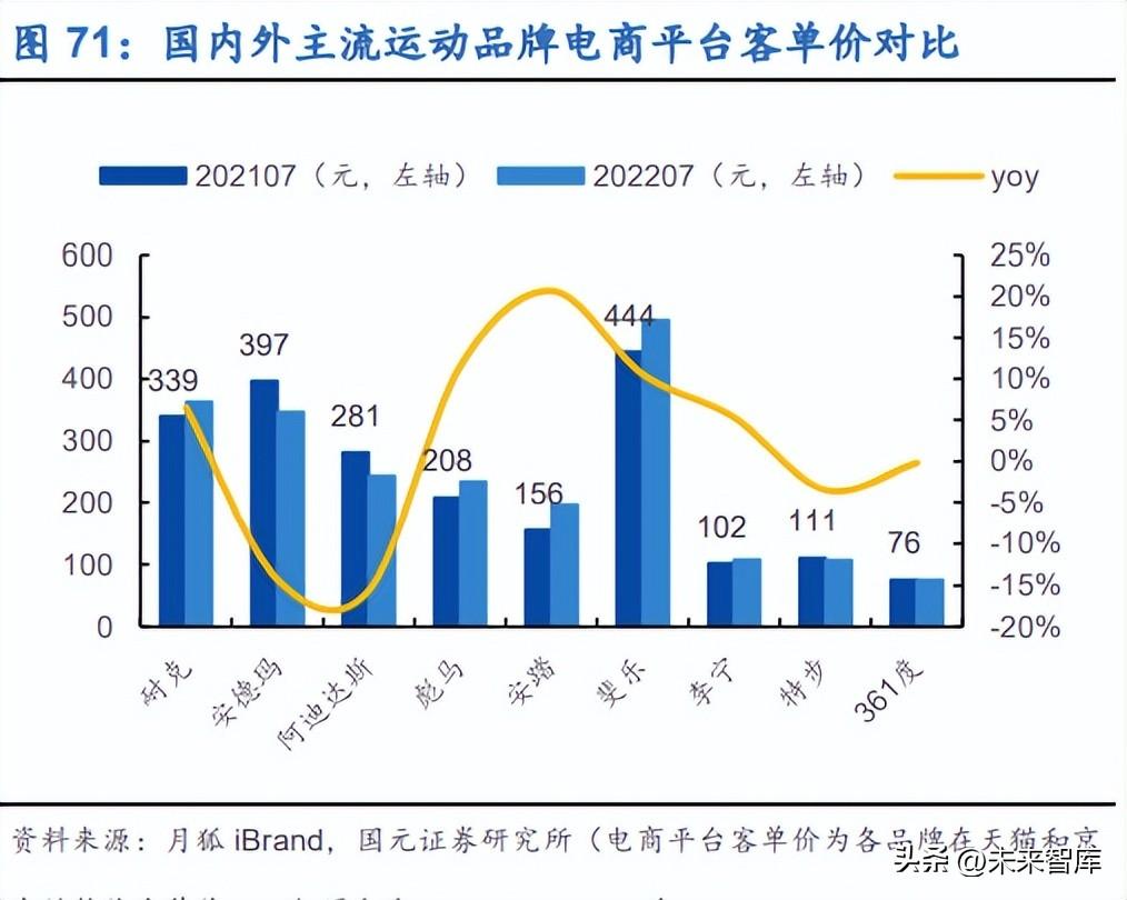 而隨著國產(chǎn)品牌 在產(chǎn)品品質(zhì)、專業(yè)技術(shù)方面的持續(xù)升級,消費者對于國產(chǎn)運動服飾的觀念發(fā)生轉(zhuǎn)變, 從原來認為國貨是低價平替產(chǎn)品、體現(xiàn)愛國情懷,到更關(guān)注產(chǎn)品的款式、風(fēng)格、質(zhì)量, 也更愿意為國產(chǎn)品牌支付溢價。根據(jù)月狐 iBrand 數(shù)據(jù),2022 年 7 月,安踏/斐樂/李 寧的電商客單價分別為 197/496/108 元,分別同比增長 20.7%/10.5%/5.2%。我們認 為,隨著國產(chǎn)運動服飾產(chǎn)品矩陣完善、功能性細分化及消費者對運動品質(zhì)的更高要求, 國產(chǎn)運動服飾的產(chǎn)品消費均價有望進一步提升。