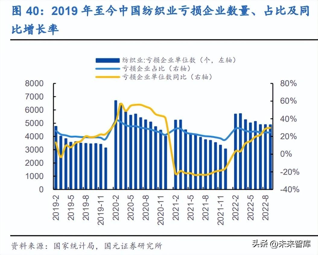 疫情及宏觀環(huán)境影響下,紡織行業(yè)低產(chǎn)能或逐步出清。根據(jù)工信部數(shù)據(jù),2022 年 1-9 月,中國規(guī)模以上紡織企業(yè)工業(yè)增加值同比下降 0.4%,營業(yè)收入 38563 億元, 同比增長 3.1%;利潤總額 1345 億元,同比下降 24.0%;行業(yè)虧損面 24.3%,同比 擴大 2.7pct。疫情及宏觀環(huán)境影響下,經(jīng)營困難的紡服企業(yè)數(shù)量同比大幅提升,持續(xù) 虧損下或逐步退出行業(yè),而頭部企業(yè)更有抵御經(jīng)營風(fēng)險的經(jīng)驗和能力,更有望抓住疫情放開和經(jīng)濟回暖之后的行業(yè)機會。
