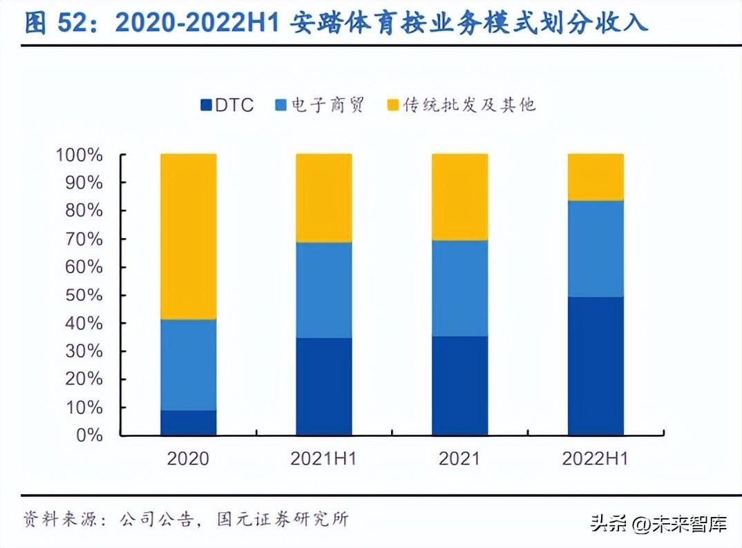 重視 DTC 運營,推進零售化改革。DTC 模式能夠幫助公司實現(xiàn)與終端零售的高打 通,更好地監(jiān)控及分配門店庫存,靈活調(diào)整零售折扣,快速回應(yīng)消費者需求。安踏自 2020 年 8 月啟動 DTC 模式轉(zhuǎn)型,根據(jù)安踏體育公司公告,截至 2022H1,公司已在 21 個省市采用混合運營模式,在 DTC 模式下,總計約 6600 家安踏及安踏兒童門店 中,約 52%由公司直營,48%由加盟商按標準運營;DTC 收入為 66.47 億元,同比 增長 79.3%,占總收入的比例為 49.7%,同比提升 14.7pcts。