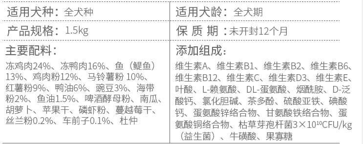這是一款無谷狗糧,原料前五位是,凍雞肉24%、凍鴨肉16%,鳀魚13%,雞肉粉12%,馬鈴薯粉10%,原料很透明。而且含肉量65%,粗蛋白含量≥32%,粗脂肪含量≥14%,有豐富果蔬和草本配方,還有益生菌成分,營(yíng)養(yǎng)健康。