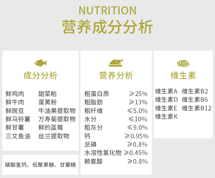 而且蛋白質(zhì)含量也高,粗蛋白含量高達(dá)36%,粗脂肪22%,水分9%、鈣磷比為1.5,完全可以滿足狗狗生長(zhǎng)發(fā)育所需要的營(yíng)養(yǎng),無任何肉粉及內(nèi)臟等副產(chǎn)物添加,不含谷物,真材實(shí)料,同時(shí)減少寵物腸胃負(fù)擔(dān),消化吸收的更好。