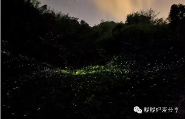 很快就能看到螢火蟲了,小小的,有著微弱的光,在黑暗中的樹叢間飛來飛去。越往河流深處走,就越密集,甚至能看到像閃亮的圣誕樹一般的場景。長這么大,我從來也沒見過螢火蟲,所以估計我比暖暖還要激動。手機拍不出來這么漂亮的場景,放一張別人專業(yè)拍的場景充數(shù)吧!