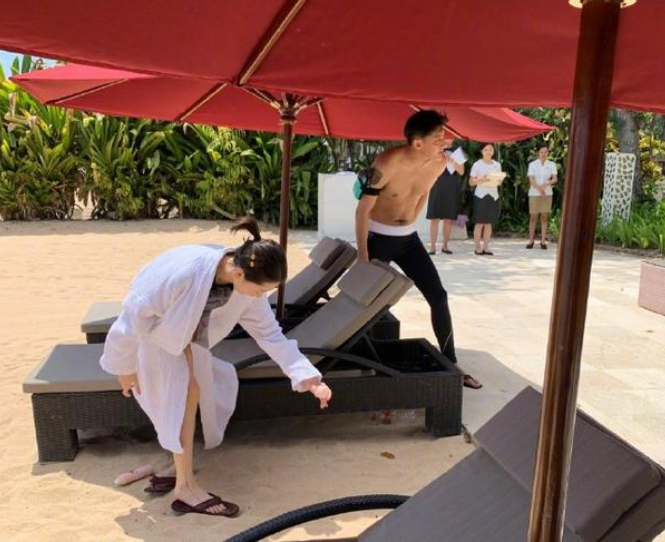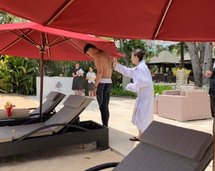 在給黃子韜噴完之后,周冬雨沒有直接讓他幫忙給自己弄防曬,反而是另外找了一個(gè)女性工作人員來(lái)幫自己弄,順便也脫去了白色的浴袍,露出全黑的泳裝。