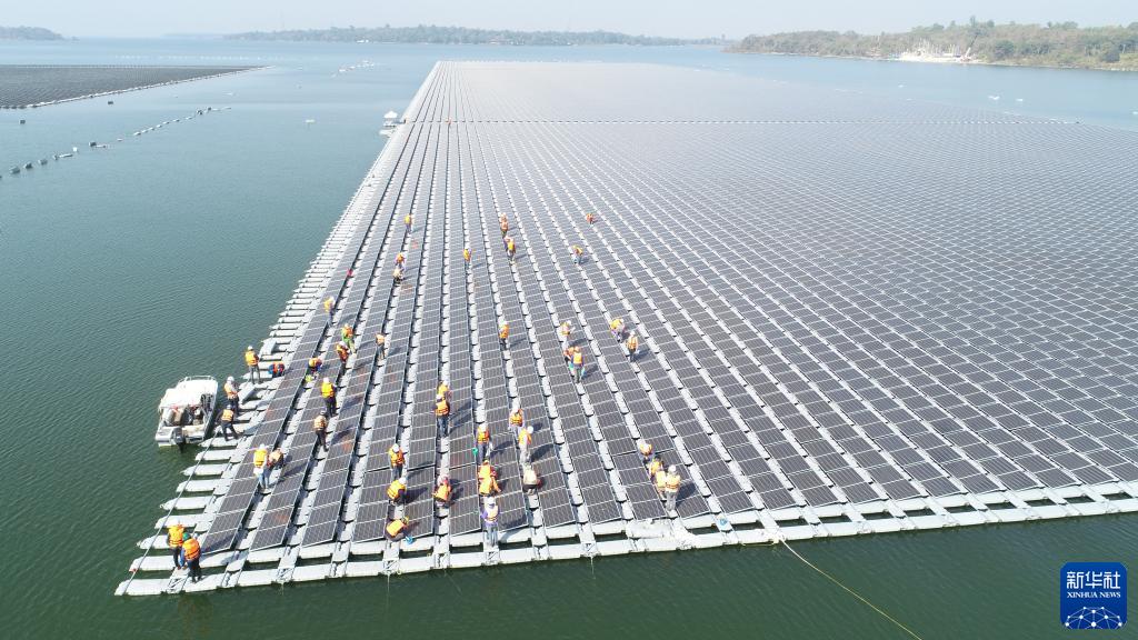 2021年1月23日,施工人員檢查中泰兩國(guó)聯(lián)合承建的泰國(guó)烏汶府詩(shī)琳通大壩綜合浮體光伏項(xiàng)目的太陽(yáng)能板安裝情況。新華社發(fā)(泰國(guó)電力局項(xiàng)目組供圖)