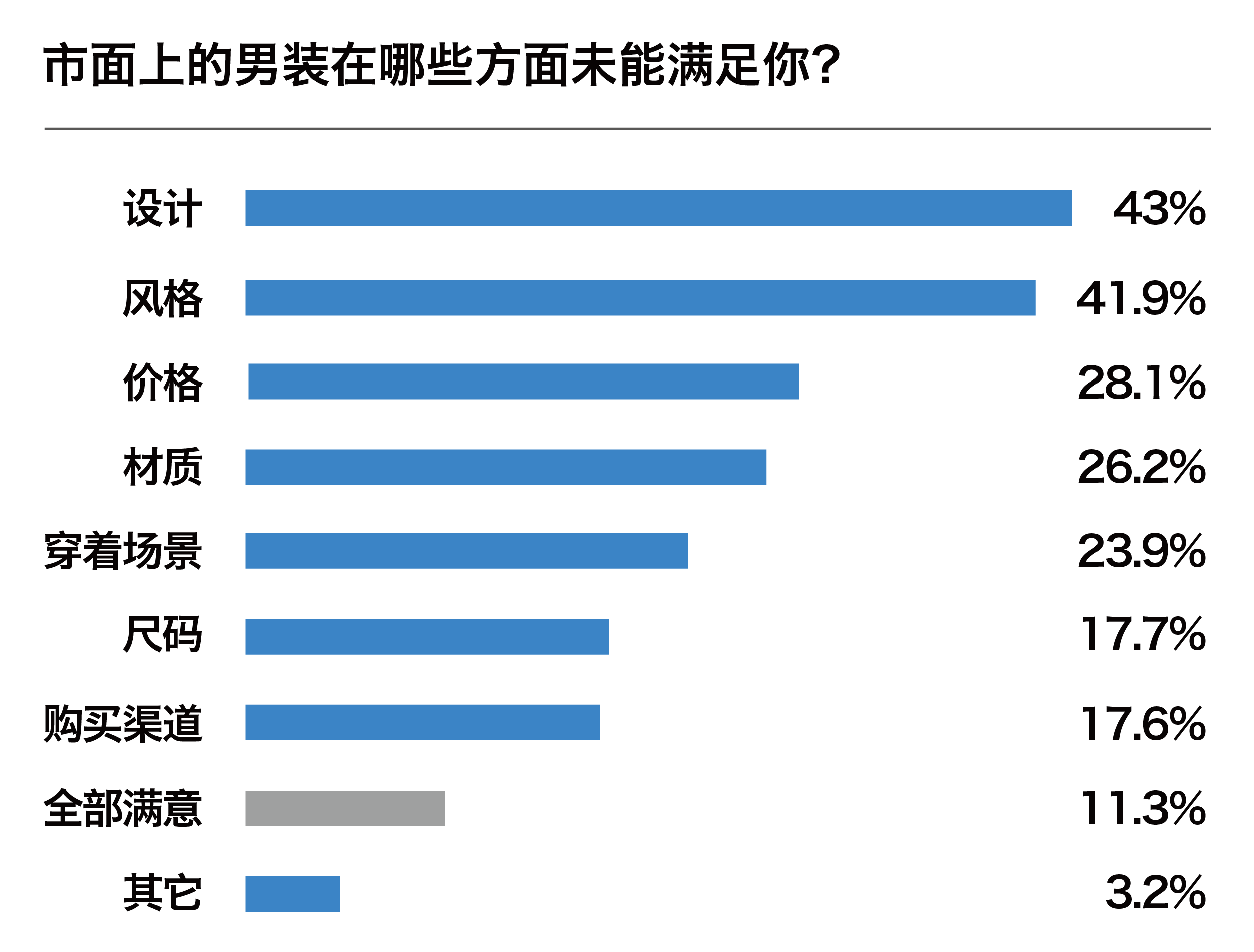 《華麗志中國新生代時(shí)尚消費(fèi)白皮書2018》對男性受訪者的統(tǒng)計(jì)顯示:88.7%的男性表示自己在購買服裝時(shí)存在痛點(diǎn),尤其認(rèn)為市場中的男裝在設(shè)計(jì)(43%)、風(fēng)格(41.9%)上尚難滿足他們的需求,其次是在價(jià)格(28.1%)、材質(zhì)(26.2%)、穿著場景(23.9%)、尺碼(17.7%)上也存在痛點(diǎn)。