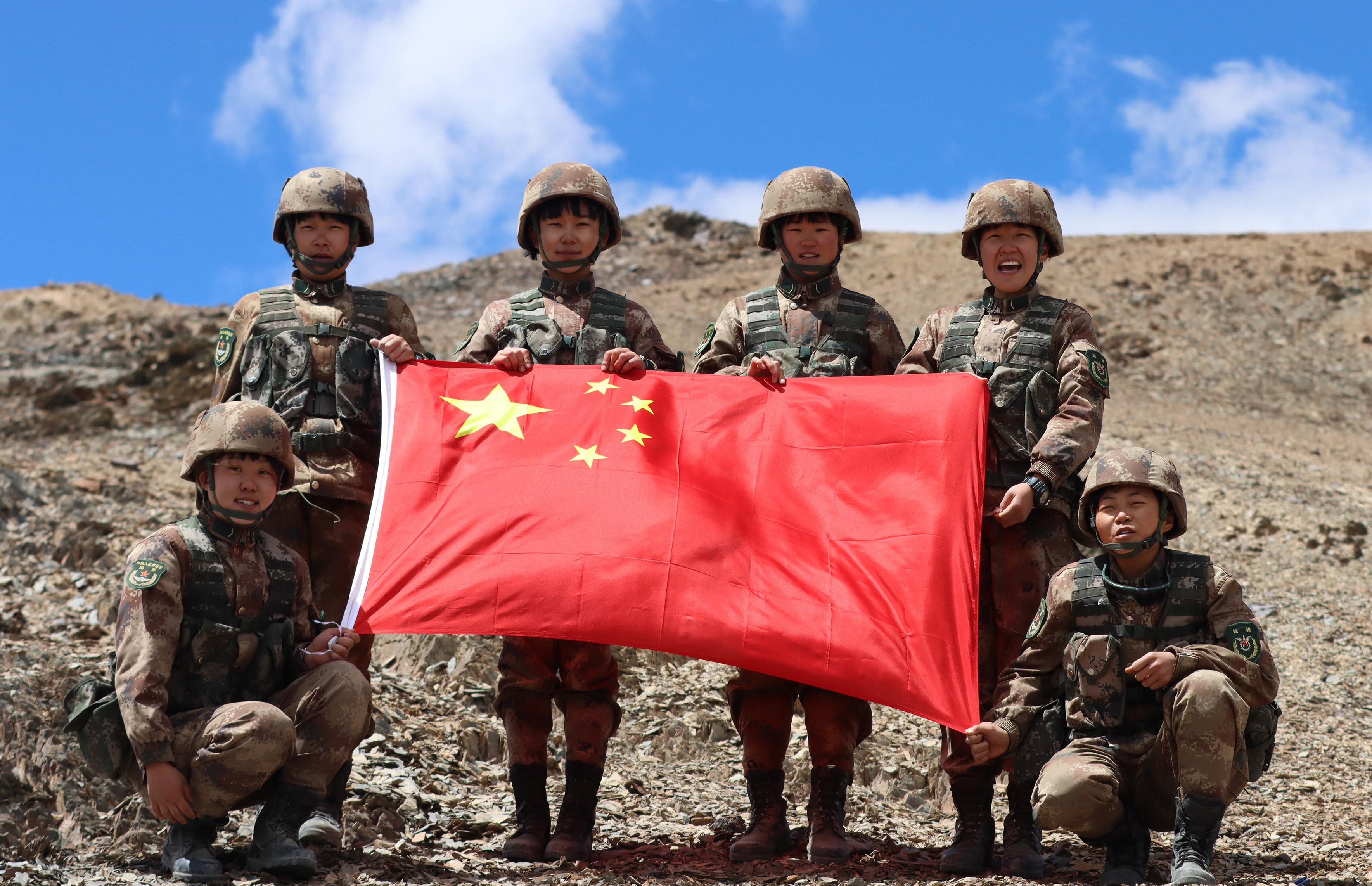 許佳佳和坦克女兵班的戰(zhàn)友們在喀喇昆侖高原展示國旗。(張浩文 攝)