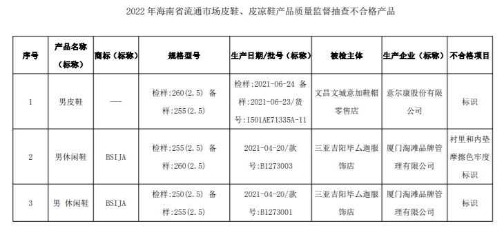 近期,海南省市場監(jiān)管局對全省流通市場皮鞋、皮涼鞋產(chǎn)品進行了監(jiān)督抽查。本次抽查了20批次產(chǎn)品,經(jīng)檢驗,不合格3批次,不合格樣品具體信息為:意爾康股份有限公司生產(chǎn)的男皮鞋、廈門淘灘品牌管理有限公司生產(chǎn)的2批次“BSIJA”牌男休閑鞋。