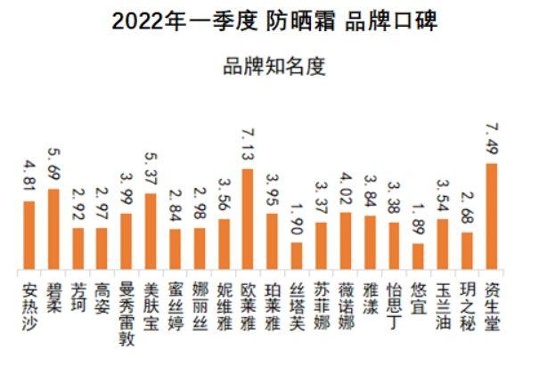 分維度來看:品牌知名度方面,資生堂、歐萊雅、碧柔位居前三。美膚寶、安熱沙、薇諾娜、曼秀雷敦、珀萊雅、雅漾、妮維雅分列第四至第十位。