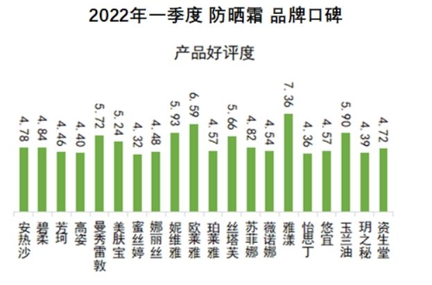 產(chǎn)品好評(píng)度方面,雅漾、歐萊雅、妮維雅位居前三。玉蘭油、曼秀雷敦、絲塔芙、美膚寶、碧柔、蘇菲娜、安熱沙分列第四至第十位。