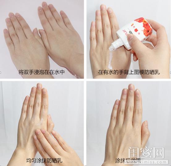 在浸泡水后的手背上直接涂抹防曬乳液,均勻涂抹后,防曬液完全被吸收,而手背上的水珠依然還在,可見產(chǎn)品的防水性很好,可直接在濕皮膚上使用。