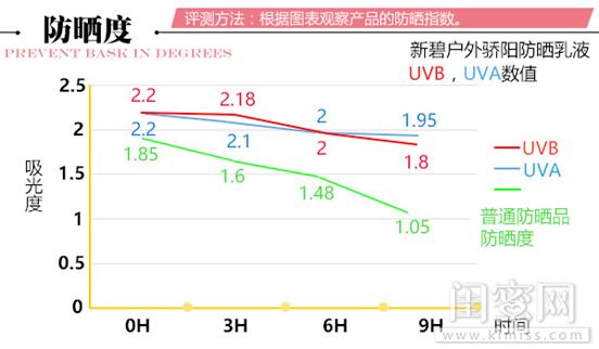 從實驗結(jié)果可看出,新碧戶外驕陽防曬乳液防曬能力很好,剛開始和6小時后,對抗紫外線吸收能力都有優(yōu)異的表現(xiàn),不受紫外線分解;9小時后,防曬指數(shù)雖有所下降,但幅度較小,說明產(chǎn)品能嚴密阻礙UVA和UVB的長時間照射,有效防止曬黑。進一步證明強防曬指數(shù)SPF130 PA++++優(yōu)越的防曬性能。