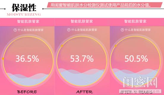 使用KIMISS智能肌膚水份檢測儀——iFace,測試新碧戶外驕陽防曬乳液前后的水份變化,從圖片可看出,使用前肌膚水分值36.5%,使用后即時水分值為53.7%,上升幅度大,能及時保留補充水分,令肌膚水潤柔滑。一小時后水分值下降為50.5%,下降幅度較小,阻擋了日曬后水分的流失,可見其保水能力好。