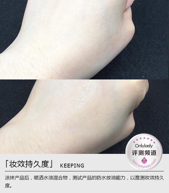 涂抹防曬后噴灑水油混合物,20分鐘后沒有出現(xiàn)浮粉、溶解等現(xiàn)象,且手背的水滴較大,說明此款防曬在遇到水之后不會影響防曬效果。這樣一來,在炎熱的夏天即使大汗淋漓也不用太擔心會花妝啦!持續(xù)防曬7.5小時可不是說說而已哦!