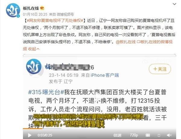 【宅秘新聞】1月17日消息,據(jù)@板扎在線 報(bào)道,遼寧一網(wǎng)友稱自己購(gòu)買的夏普電視機(jī)一次沒(méi)看就壞了,而且無(wú)處維權(quán),“兩個(gè)月就壞了,不退不換不修理,聯(lián)系賣家可橫了”。據(jù)了解,該網(wǎng)友購(gòu)買的電視機(jī)屏幕上方出現(xiàn)了彩色條紋后,于是就聯(lián)系了夏普電視售后,但對(duì)方告知這是用戶自己安裝手指頭捏壞的,不退不換,不給維修。
