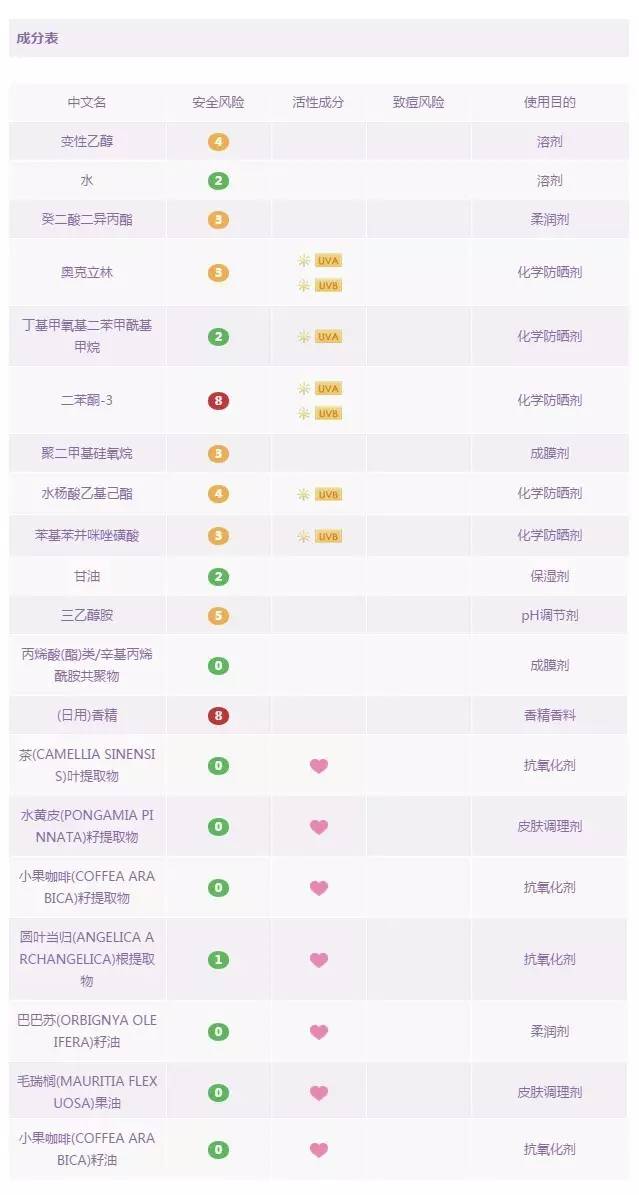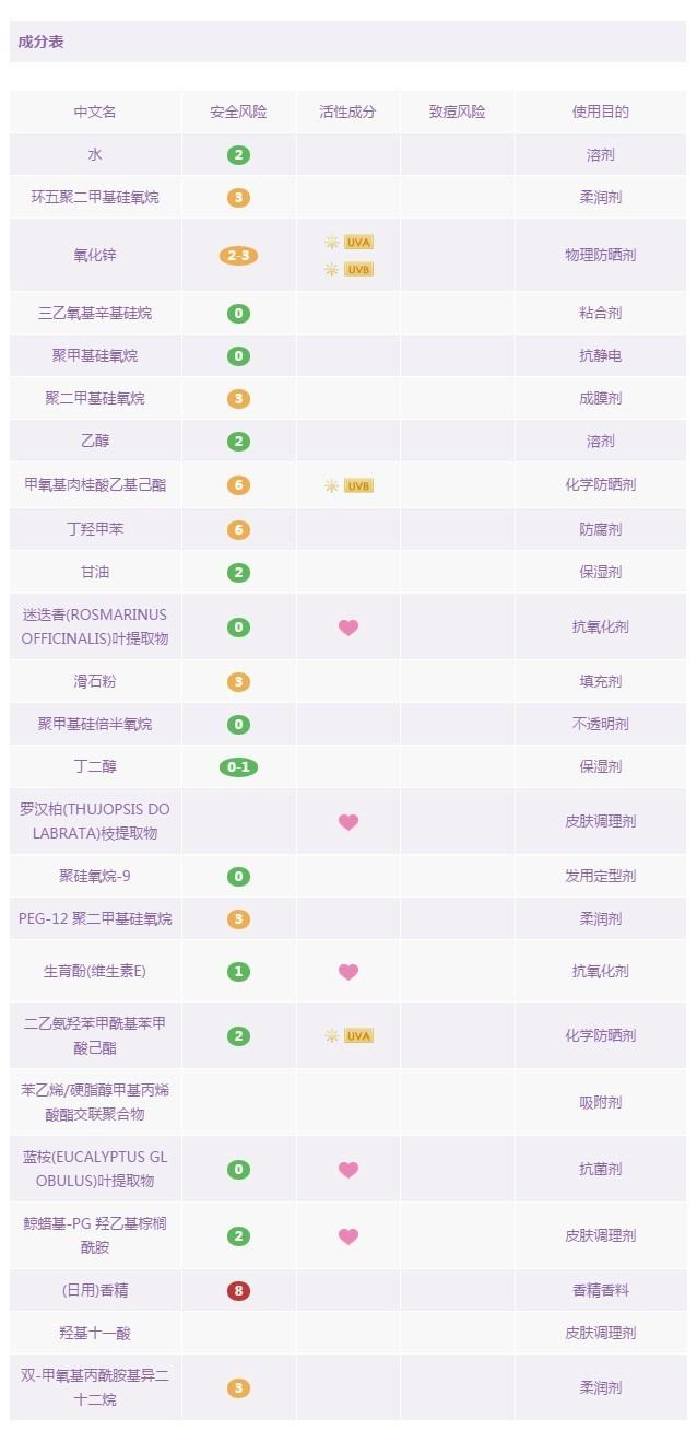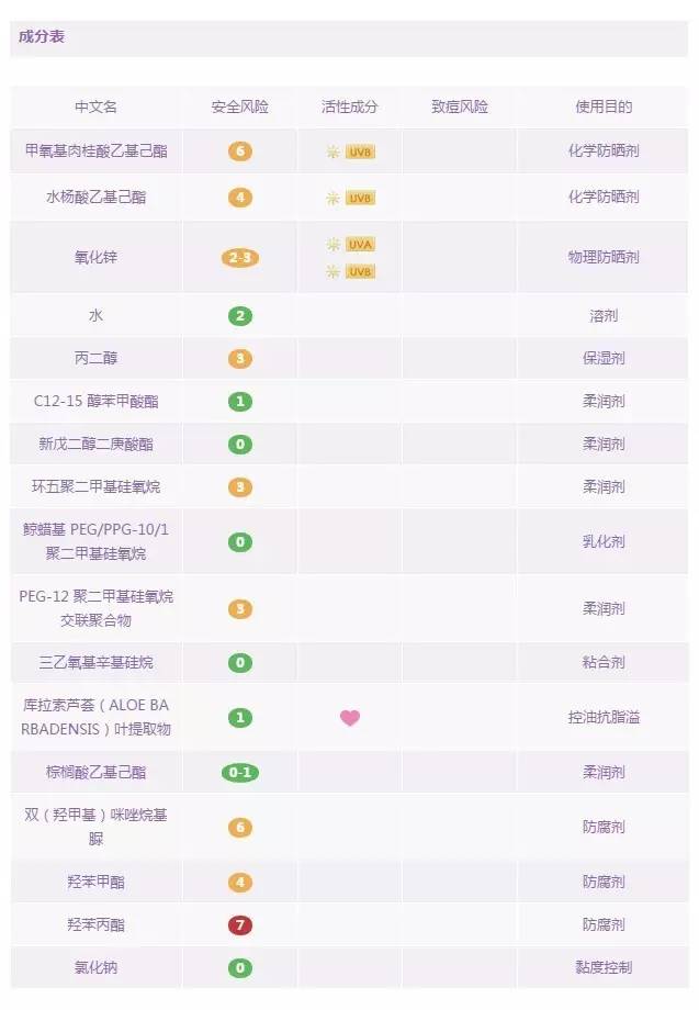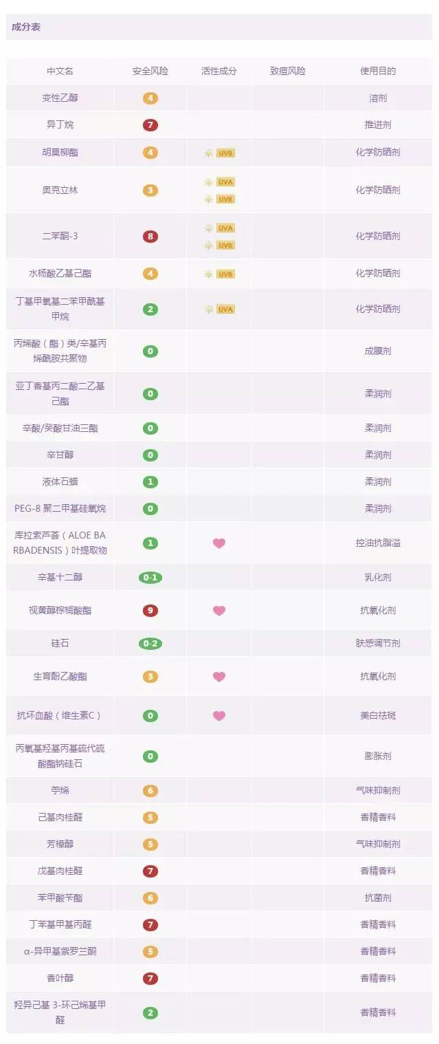 說到這款防曬,應(yīng)該會有很多學(xué)生黨表示,對對對,就是它!這款平價的碧柔經(jīng)典小藍(lán)管曾經(jīng)伴隨著許多人度過了他們的青春年代。它清爽的質(zhì)地,淡淡的香氣,也是很多人關(guān)于暑假的回憶。首先,它是一款純化學(xué)的防曬產(chǎn)品。其中的防曬劑:甲氧基肉桂酸乙基己酯&二乙氨基羥苯甲?;郊姿峒乎ィ瑥姆罆癫ǘ紊蟻砜创钆溥€是合理的。但它的防腐劑中含有羥苯丁酯+羥苯丙酯這兩種尼泊金酯類化合物,部分肌膚敏感受眾可能會引起皮炎,且里面含有酒精成分,部分對酒精過敏的膚質(zhì)也不太適用。