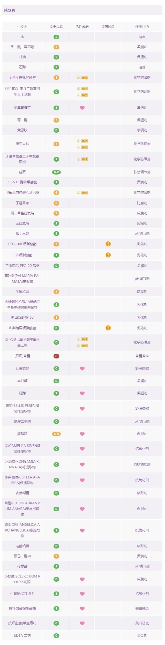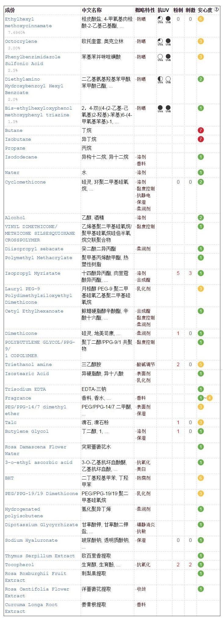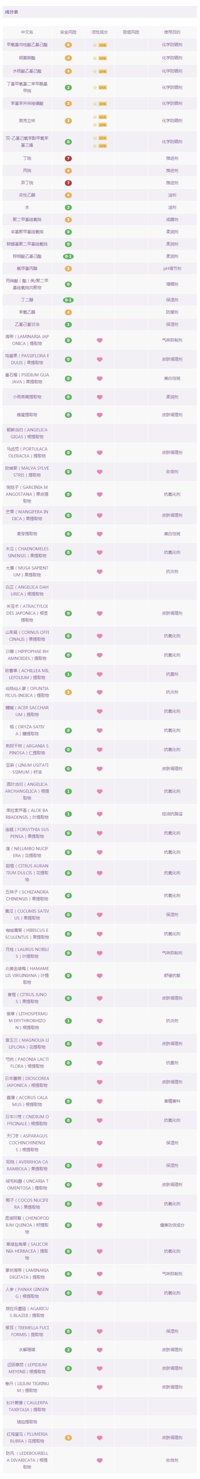 POLA是日本高端護(hù)膚系里比較低調(diào)的一個品牌。他主打的抗糖化成分,也是一種新型的美白理念。這款防曬質(zhì)地很清爽,且氣味和膚感都透著雅致的尊貴感。且抗糖化的活性物添加,讓它同時可以兼?zhèn)浞罆窈兔腊椎碾p重功。我個人還是對它偏愛有加的。這款同樣是物理結(jié)合化學(xué)的綜合型防曬,其中物理防曬成分:二氧化鈦,氧化鋅。化學(xué)防曬成分:二乙氨基羥苯甲?;郊姿峒乎?,雙-乙基己氧苯酚甲氧苯基三嗪,甲氧基肉桂酸乙基己酯。防曬波段配合較為合理,成分也比較。但是里面依然沒有避免的使用了酒精和香精的成分,因此還是要提醒一下對這兩種物質(zhì)過敏的敏感肌妹子們,小心一點(diǎn)。