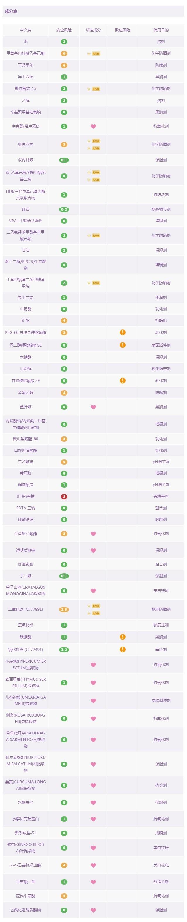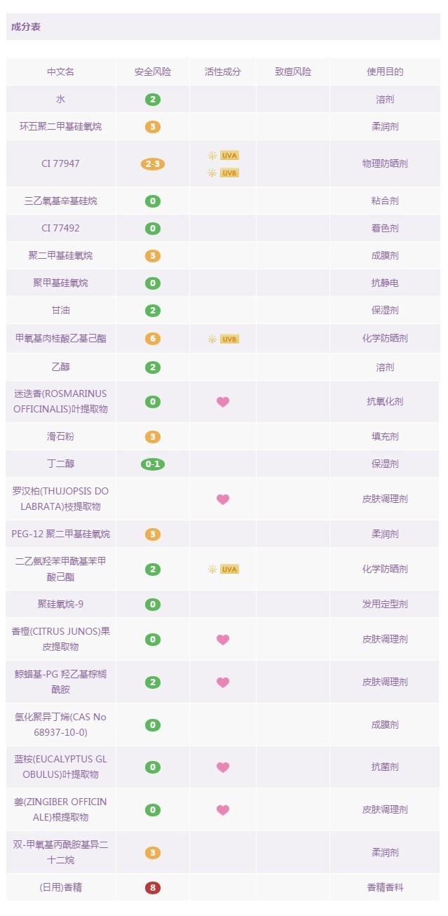 cpb是日本的高端護(hù)膚品牌,它bling~bling~的外包裝很容易讓人產(chǎn)生一種晃眼的貴婦感。那我們先來看看這款產(chǎn)品的成分是不是也這么bling~bling呢?它含6種化學(xué)防曬成分:甲氧基肉桂酸乙基己酯,聚硅氧烷-15,奧克立林,雙-乙基己氧苯酚甲氧苯基三嗪,二乙氨羥苯甲?;郊姿峒乎ィ』籽趸郊柞;淄?。 和1種物理防曬成分:二氧化鈦。防曬劑的紫外線波段配合比較且合理。之前說到奧克立林(Octocrylene)暴露在陽光下會釋放出氧自由基,于是其中加入了抗氧化的成分:維生素E(生育酚) ,且排在成分表比較靠前的位置,可以看出用料的良心,以及一系列的活性提取物的添加,也讓這款產(chǎn)品在防曬+修色的同時,同樣可以作為一款日間護(hù)膚品使用。