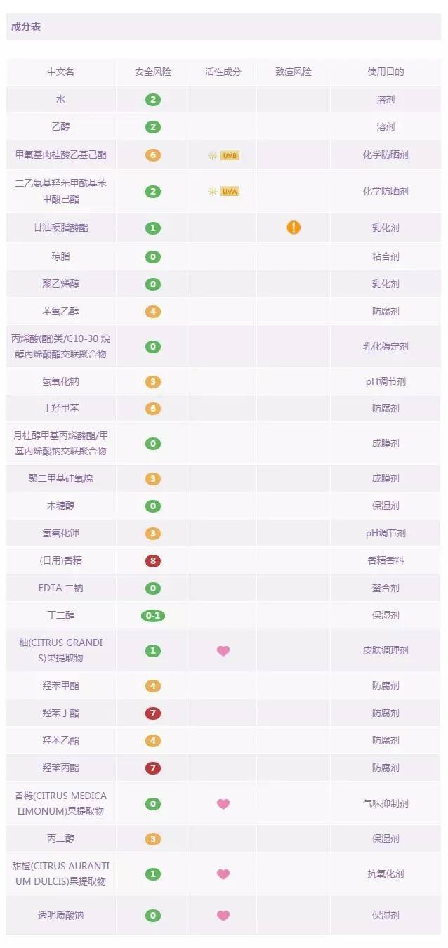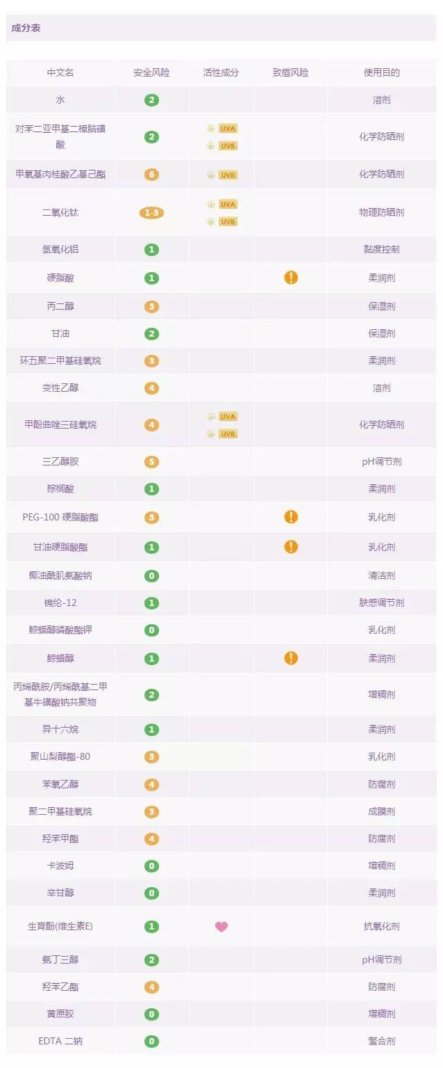 優(yōu)佳是瑞士的一款專業(yè)防曬藥妝品牌,也是瑞士皮膚科醫(yī)生推薦的防曬產(chǎn)品。這款面部專用防曬乳是由化學(xué)防曬劑和物理防曬劑共同搭配的產(chǎn)物。其中含四種化學(xué)防曬成分:奧克立林,丁基甲氧基二苯甲?;淄?,二乙基己基丁酰胺基三嗪酮,雙-乙基己氧苯酚甲氧苯基三嗪,和一種物理防曬成分:二氧化鈦 。這款產(chǎn)品難得的是:不含防腐劑,不含香料,不含高風(fēng)險成分,以及孕婦慎用成分。這種難得在防曬產(chǎn)品中少見,因此,推薦給各位媽媽和寶寶們,讓它來守護(hù)你們,叔比較放心。但遺憾的是,里面依然含有乙醇,酒精過敏者還是小心一下吧。