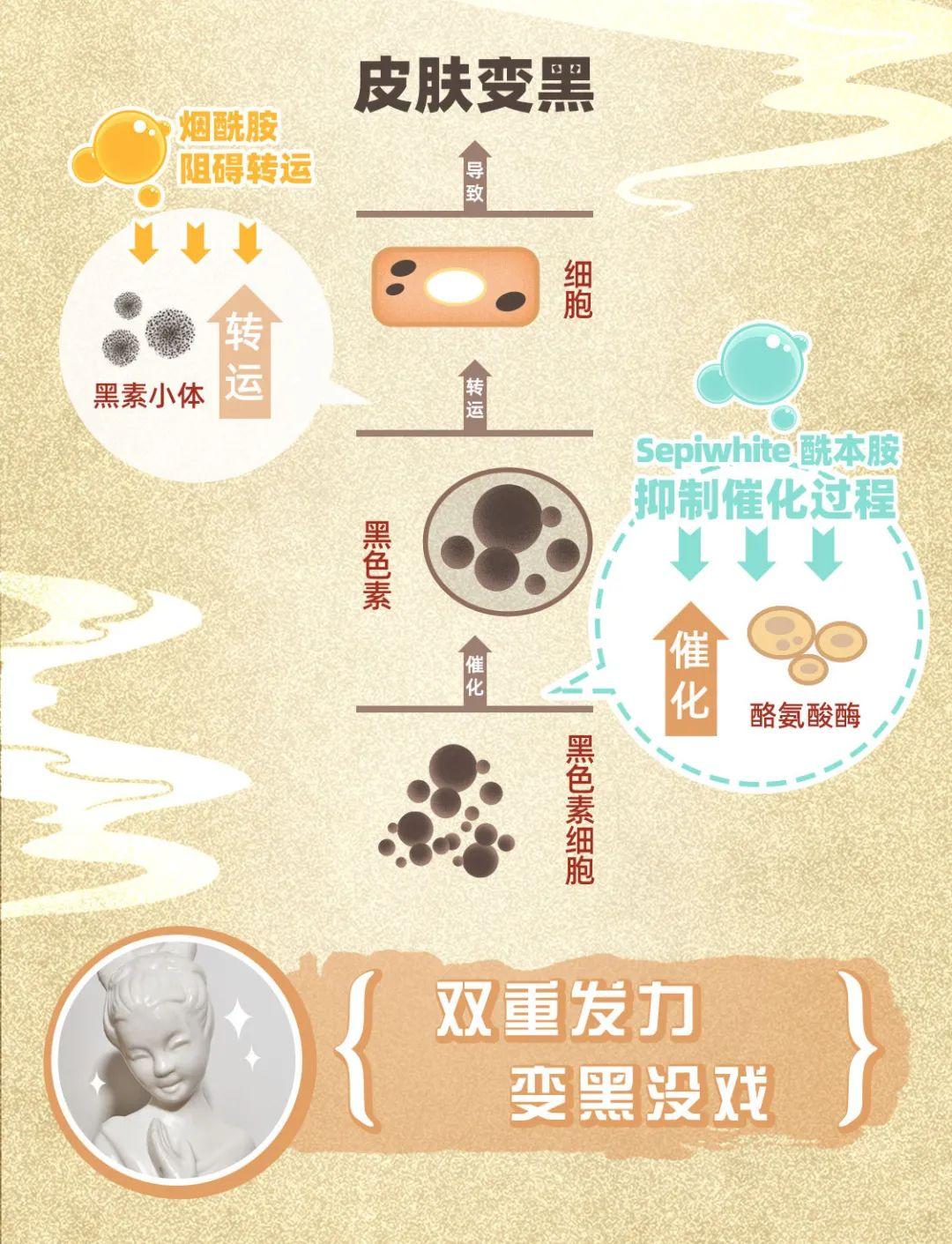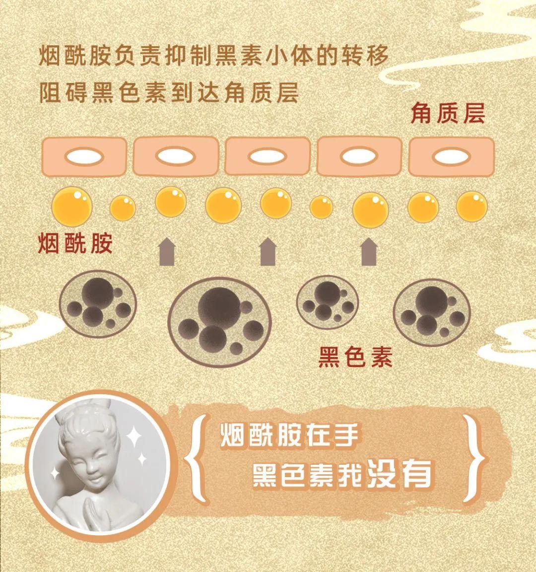 第二步:前面的工作做足之后,煙酰胺成分阻斷黑色素運(yùn)輸?shù)浇琴|(zhì)層,并實(shí)現(xiàn)一定程度的抗皺效果。