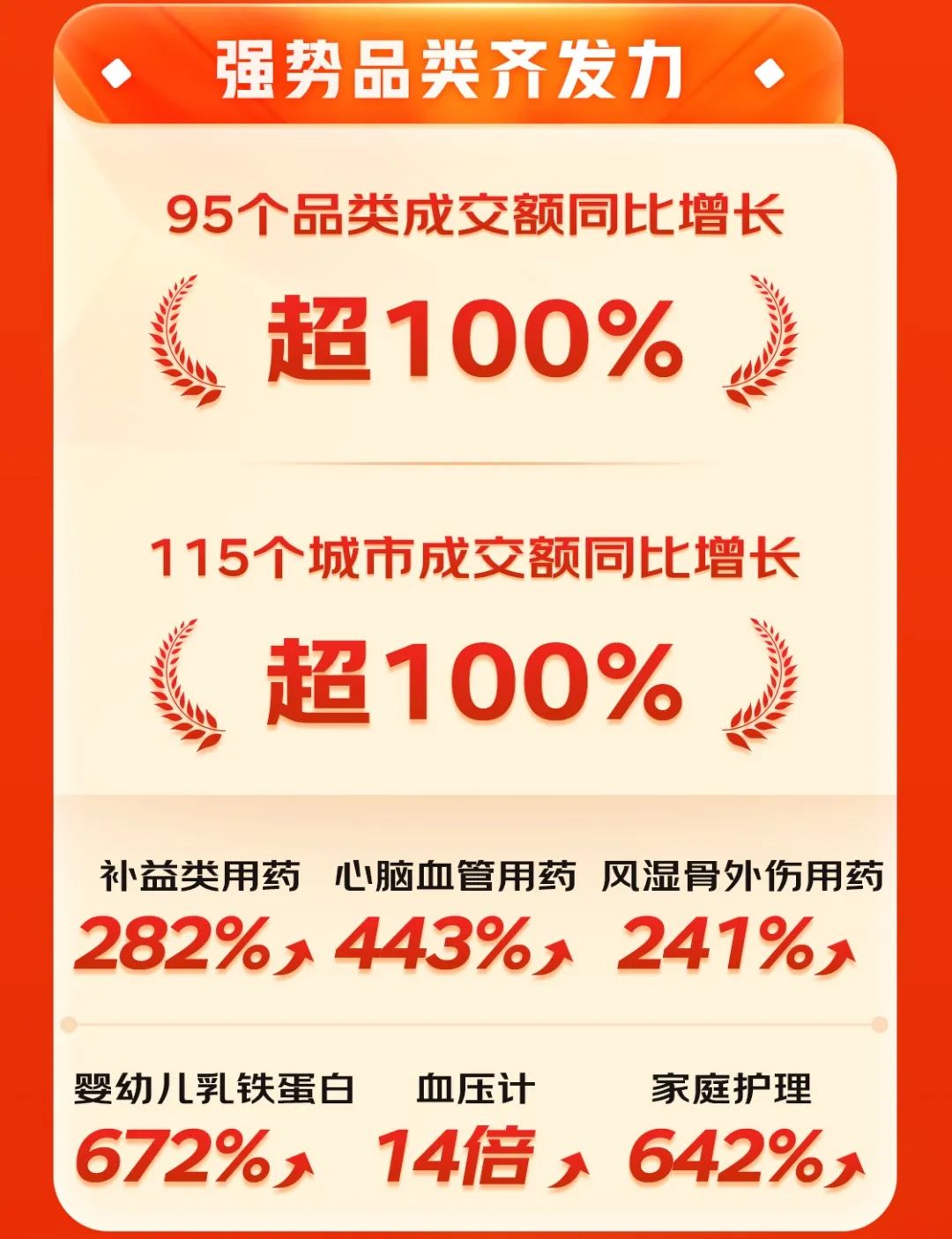 從品類來看,95個品類成交額同比增長超,115個城市成交額同比增長超。其中,補益類用藥同比增長282%,心腦血管用藥同比增長443%,風(fēng)濕骨外傷用藥同比增長241%,嬰幼兒乳鐵蛋白同比增長672%,血壓計同比增長14倍,家庭護理同比增長642%。