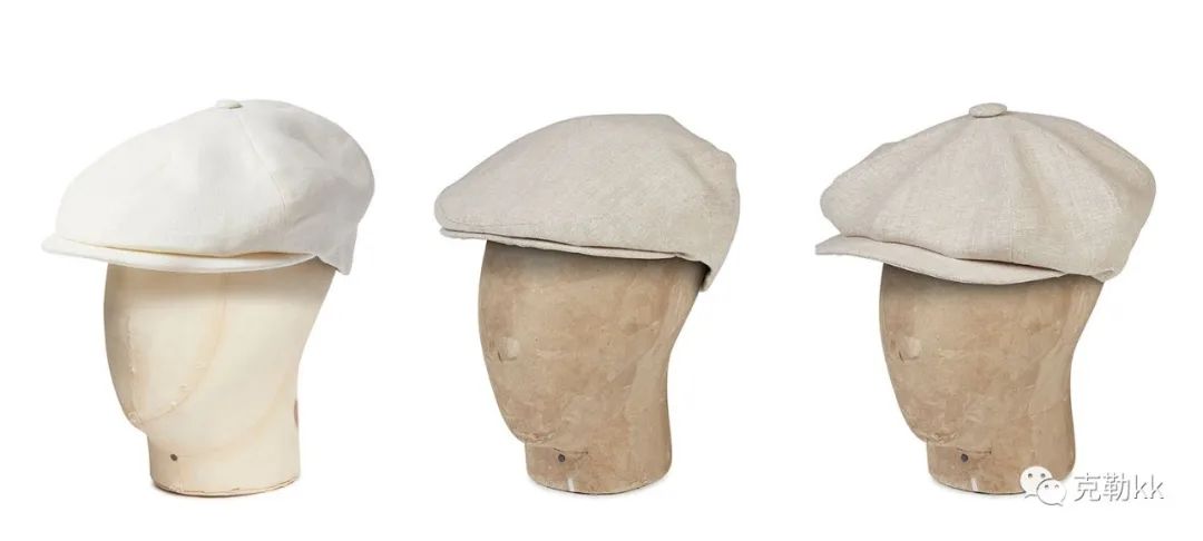 圖左叫托尼帽,是八片式的平頂帽,制作方式和蓋茨比帽一樣,頂部有一粒紐扣,但帽型和平頂帽一樣。還有一種叫羅馬帽Roma Cap(我也買過(guò)),和托尼帽的區(qū)別就是沒(méi)有頂部的紐扣,對(duì)拼接要求比較高,8個(gè)布角的拼接點(diǎn)需要縫合整齊。