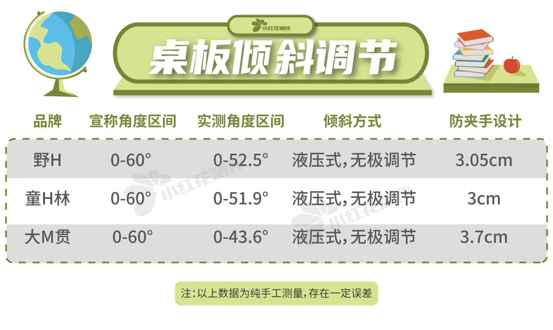 3款學(xué)習(xí)桌宣稱的角度區(qū)間均為0-60°,與實(shí)測(cè)數(shù)據(jù)有一定的誤差。