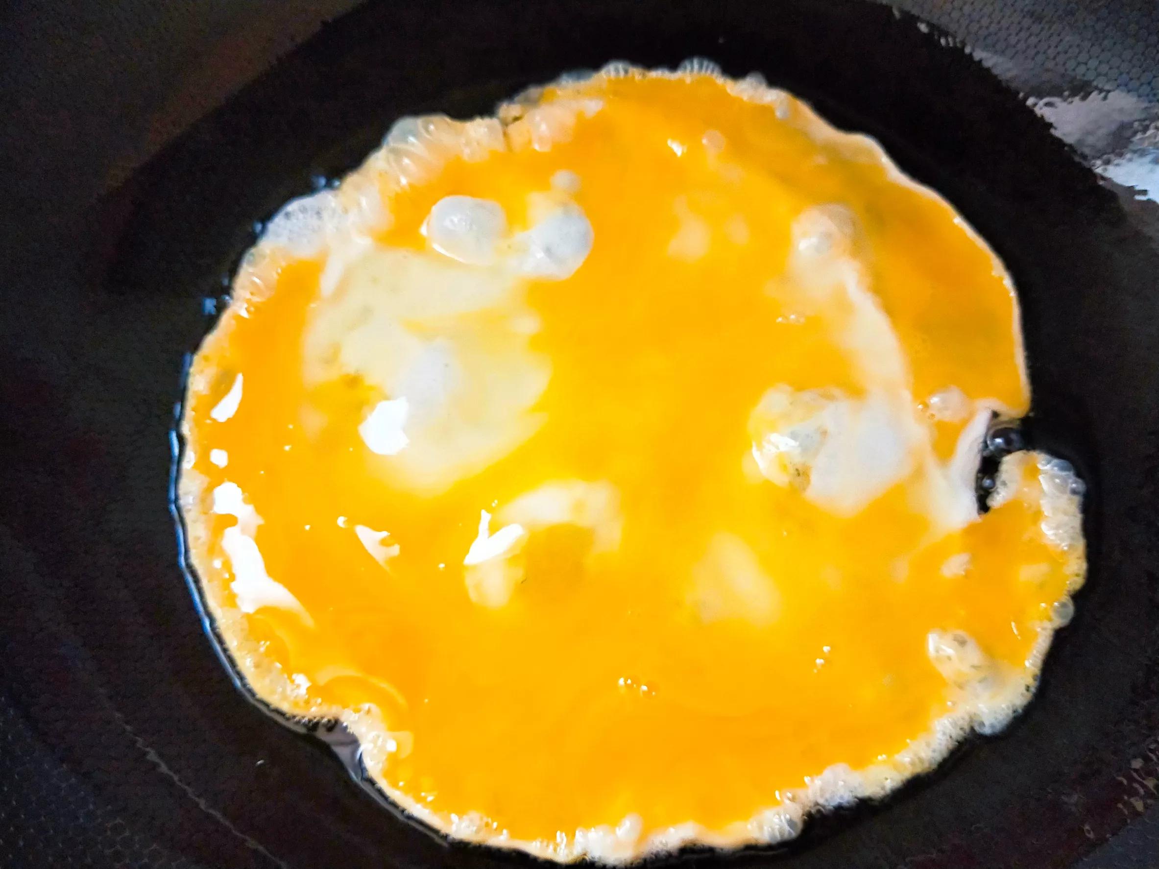 3,起鍋燒油,油熱后,改中火,倒入雞蛋液,轉(zhuǎn)動(dòng)鍋,使蛋液布滿鍋底,成型后翻面,用鍋鏟搗成塊,再翻炒一下,炒成金黃色,即可出鍋備用。