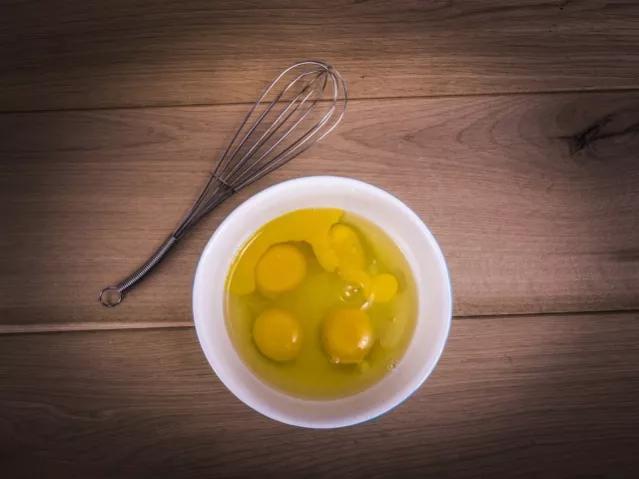 2,碗中打入四個(gè)雞蛋,倒入少許料酒、白胡椒粉和鹽打散備用。