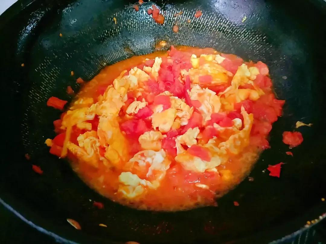 5,待西紅柿出汁后,倒入適量的味極鮮和鹽翻炒均勻,再倒入炒好的雞蛋塊,翻炒均勻。