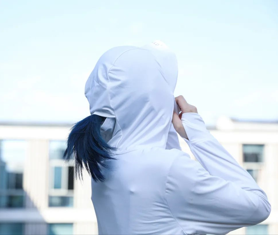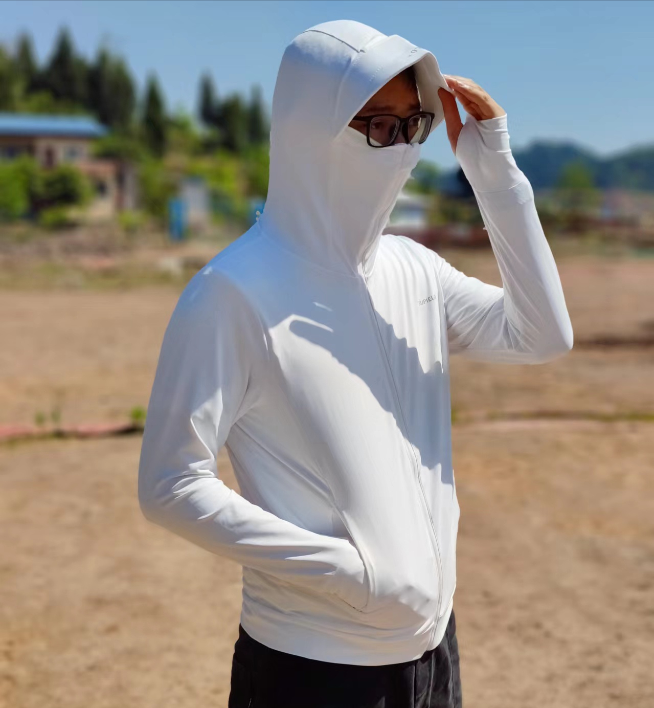 衣服是連帽拉鏈設計,拉鏈很順滑,連帽有帽舌,可以用來遮擋陽光,連著拉鏈還做了K罩,拉起來之后能很好的遮住臉部防曬,都不用戴防曬K罩了,還能很好地保護整個脖子不被曬到。