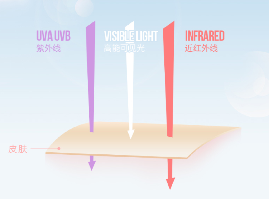 日光中包含多種波段的傷害源,其中就包括:紫外線、近紅外線、高能可見光等,這三種光波對皮膚都有著不同的傷害。這也是為什么認真涂了不少防曬霜,臉上還是長了好多黑斑和小細紋的原因。