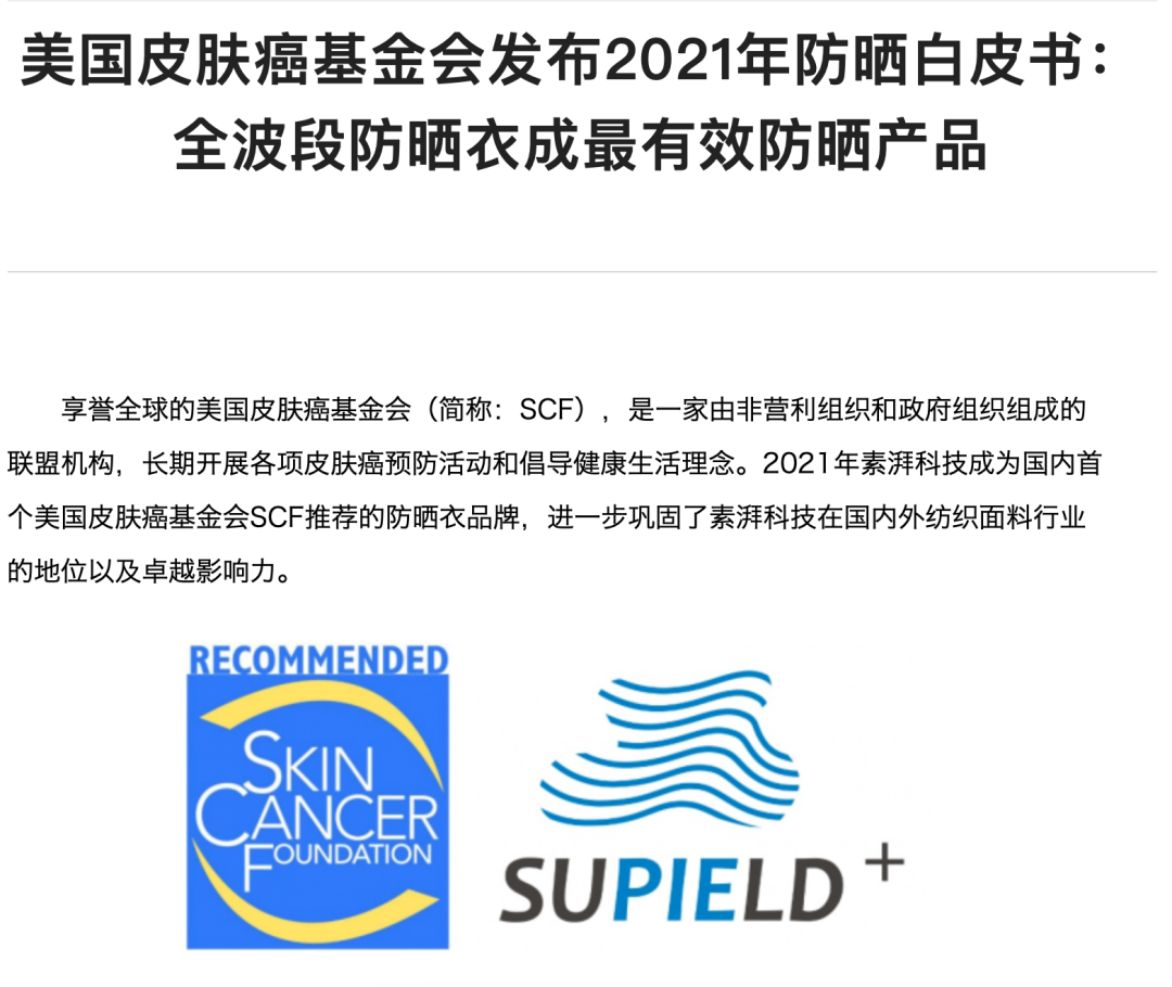素湃防曬衣還獲得一項殊榮,SCF推薦了這款防曬衣,這是目前國內(nèi)一個獲得推薦的防曬品牌。
